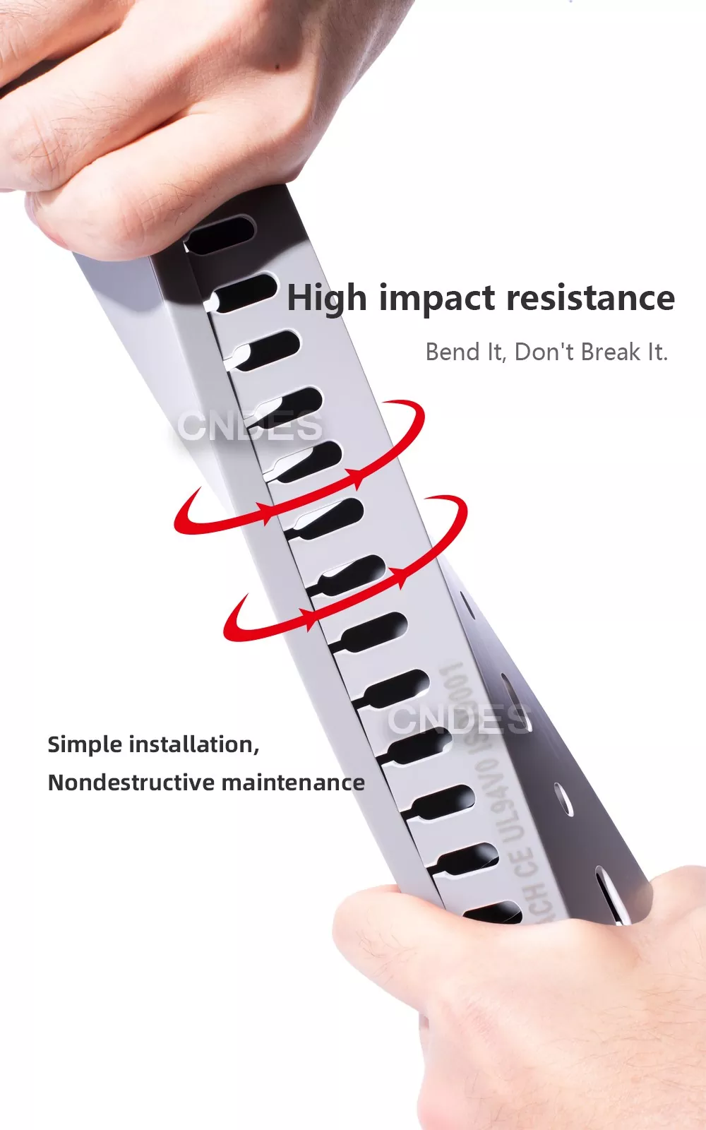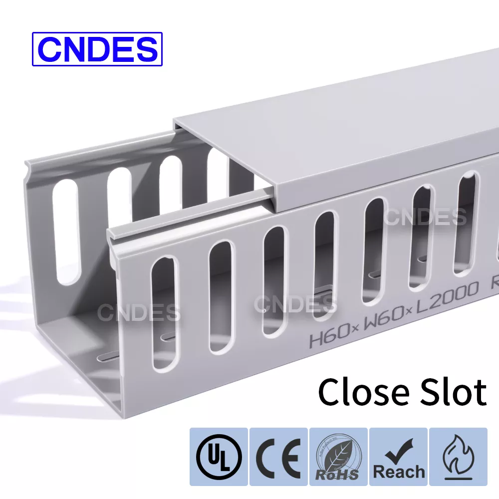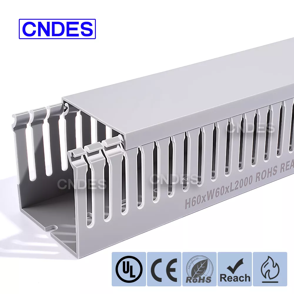 CNDES's styreskabskabelkanal er lavet af en proprietær PVC-formel. Slidsed PVC Control Cabinet Duct er miljøvenlig, flammehæmmende og slagfast og kan modstå gentagne 180° bøjninger uden at gå i stykker.