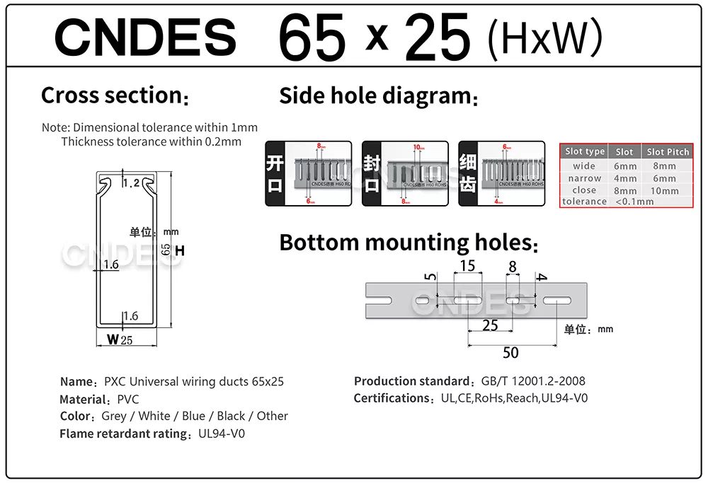 CNDES' Customized 65×25 Cable Tray Ducts er en kabelstyringskanal med slank profil lavet af stift PVC. Det bruges hovedsageligt til at styre og beskytte kabler i områder, hvor: