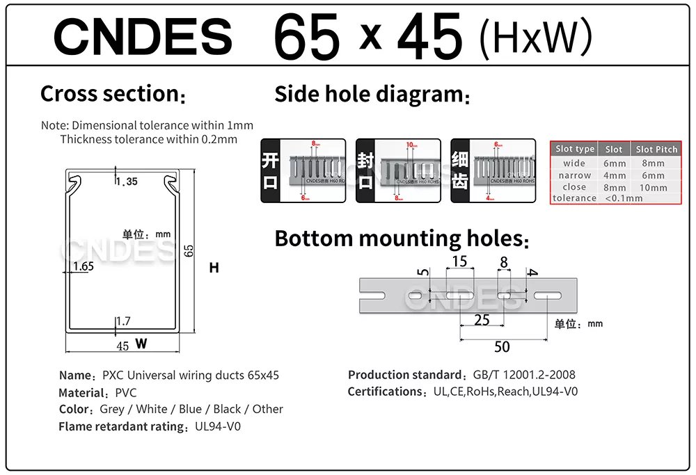 Hvis du køber tilpassede 65×45 grå slidsede PVC-ledningskanaler fra en pålidelig producent og leverandør i Kina, tilbyder CNDES ensartet kvalitet, fleksibel tilpasning og professionel service.