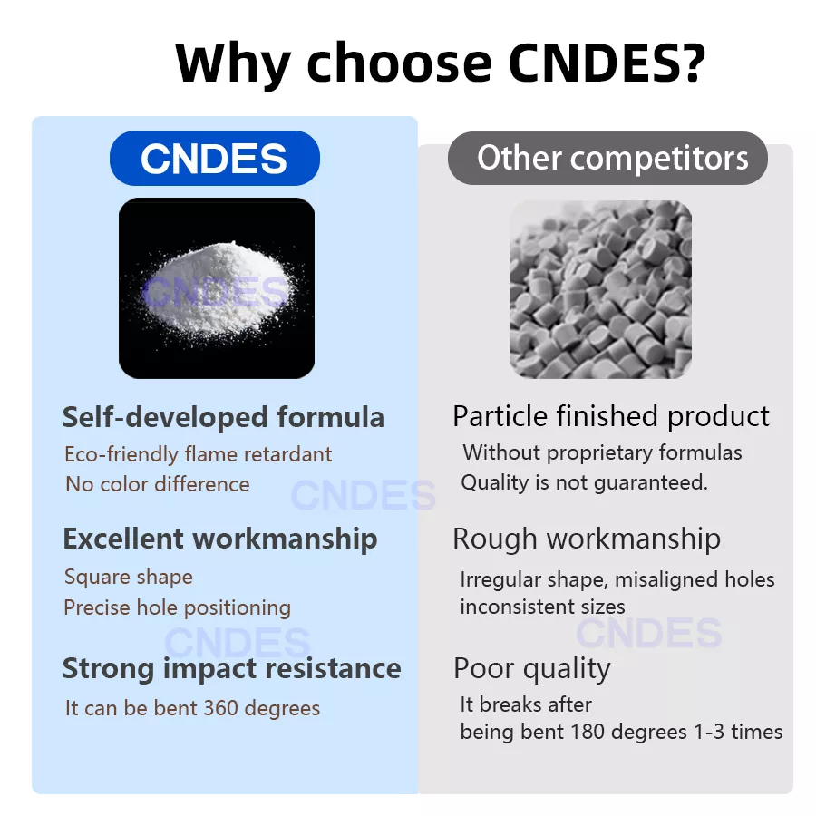 2. Styrke i industriel kvalitet, sikker og pålidelig: Kvalitets 80×80 slidsede PVC-tavleledningsrør er lavet af fortykket flammehæmmende PVC-materiale (UL94-V0), hvilket gør det robust, holdbart, slagfast og med fremragende bæreevne. Det giver varig beskyttelse af kabler selv i vibrationsmiljøer.