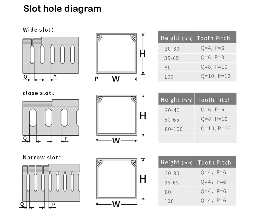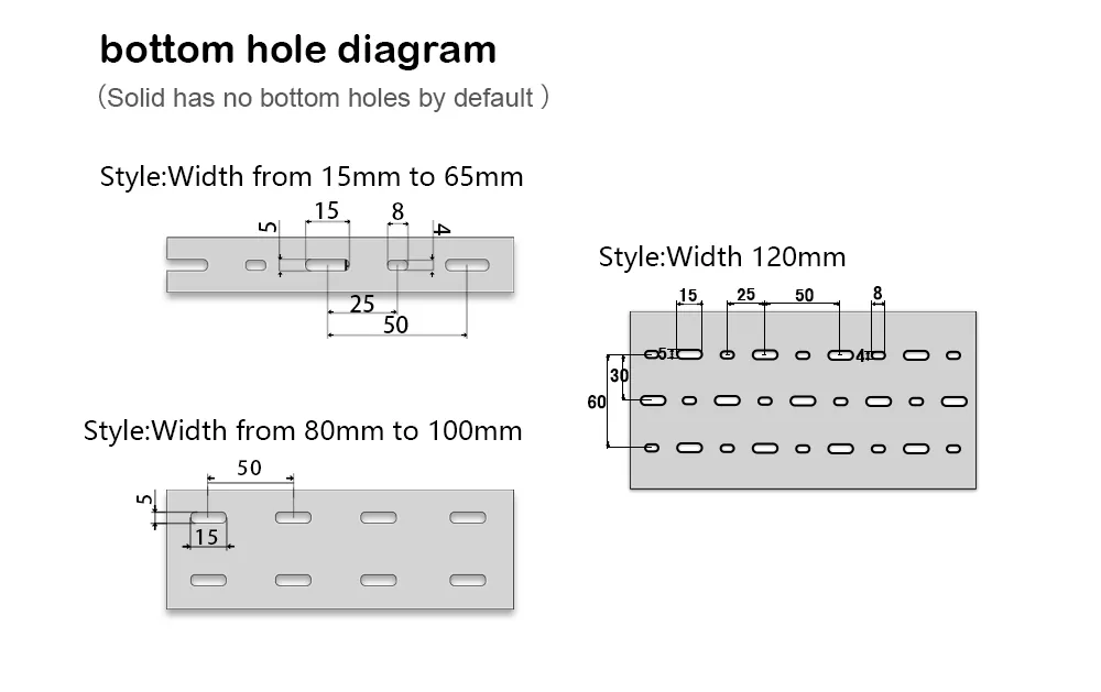 Kabelbakkens specifikationer er udtrykt som højde * bredde, hvor enheden er mm. Bestem først den nødvendige størrelse på kabelbakken, såsom 80 mm høj og 40 mm bred. Vælg derefter udløbshullets bredde baseret på tykkelsen af ledningerne, enten brede tænder (8 mm) eller fine tænder (4 mm). Det anbefales, at det faktiske kabel ikke optager mere end 70 % af bakkepladsen.